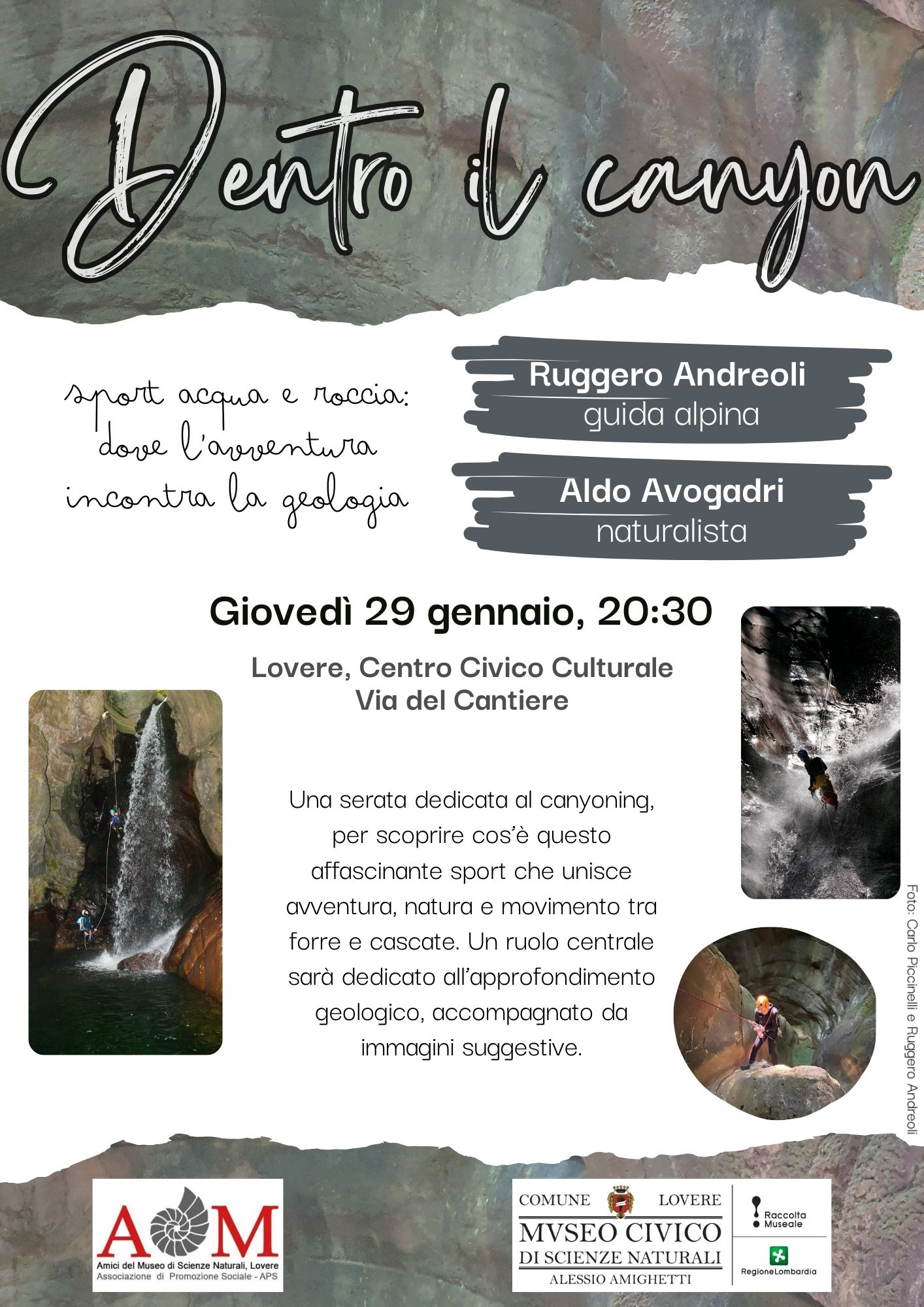 On Thursday 29 January, at 8:30 PM, at the Civic Cultural Center on Via del Cantiere in Lovere, a conference on the topic of canyoning will take place with mountain guide Ruggero Andreoli and naturalist Aldo Avogadri.