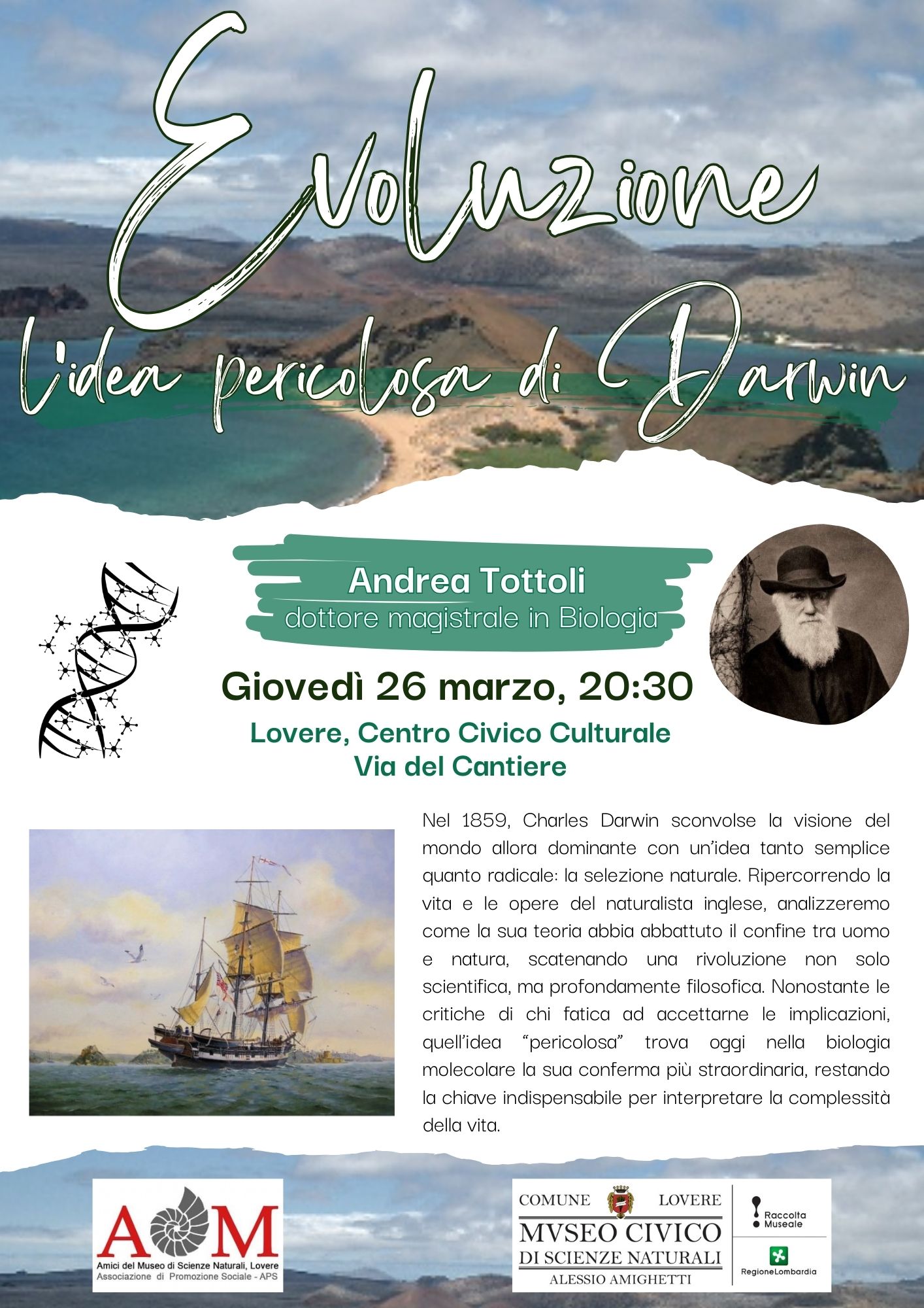On Thursday 26 March 2026, at 8:30 PM, at the Civic Cultural Center on Via del Cantiere in the Lovere Tourist Port, a conference by Andrea Tottoli, Master’s Degree in Biology, will be held, entitled “Evoluzione: l’idea pericolosa di Darwin”.