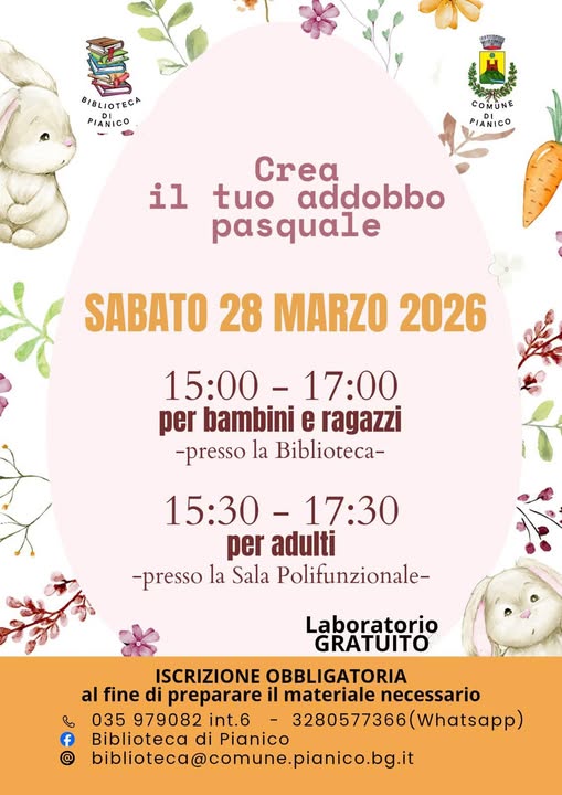On Saturday, March 28, 2026, the Municipality and the Pianico Library are organizing an “Easter Workshop” for adults, teens, and children of all ages. This afternoon, they can create a creative and fun Easter decoration together!