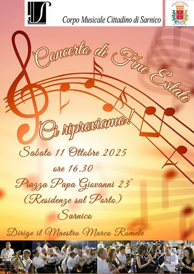On Saturday, October 11th, at 4:30 pm, in Piazza Giovanni XXIII (Residenze sul Porto) in Sarnico, the END OF SUMMER CONCERT will be held with the “Città di Sarnico” Band.