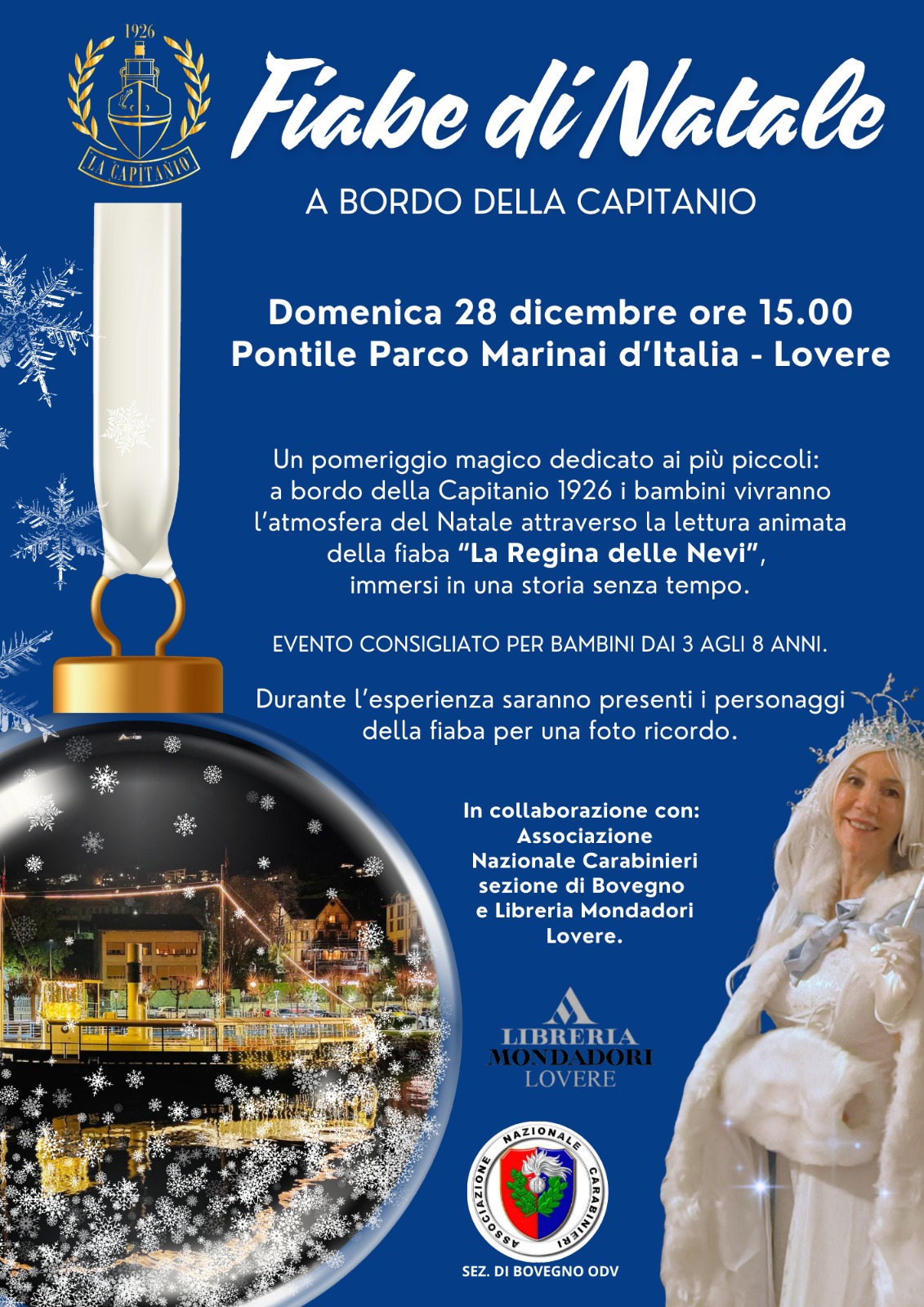 La Capitanio 1926 Association, in collaboration with the National Carabinieri Association – Bovegno Section and the Mondadori Bookstore, is pleased to invite adults and children alike to the “Christmas Fairy Tales” event, which will be held on Sunday, December 28, 2025, from 15:00 in Lovere, on the historic motor vessel “La Capitanio 1926”, moored in the Parco dei Fanti d’Italia.