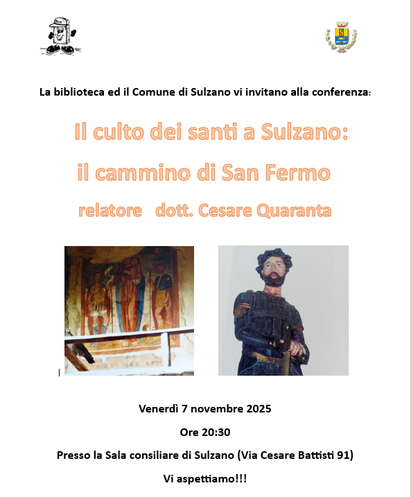 On Friday, November 7th, at 8:30 pm, a conference will be held in the Council Chamber of the Sulzano City Hall, “The Cult of Saints in Sulzano: The Path of San Fermo.”