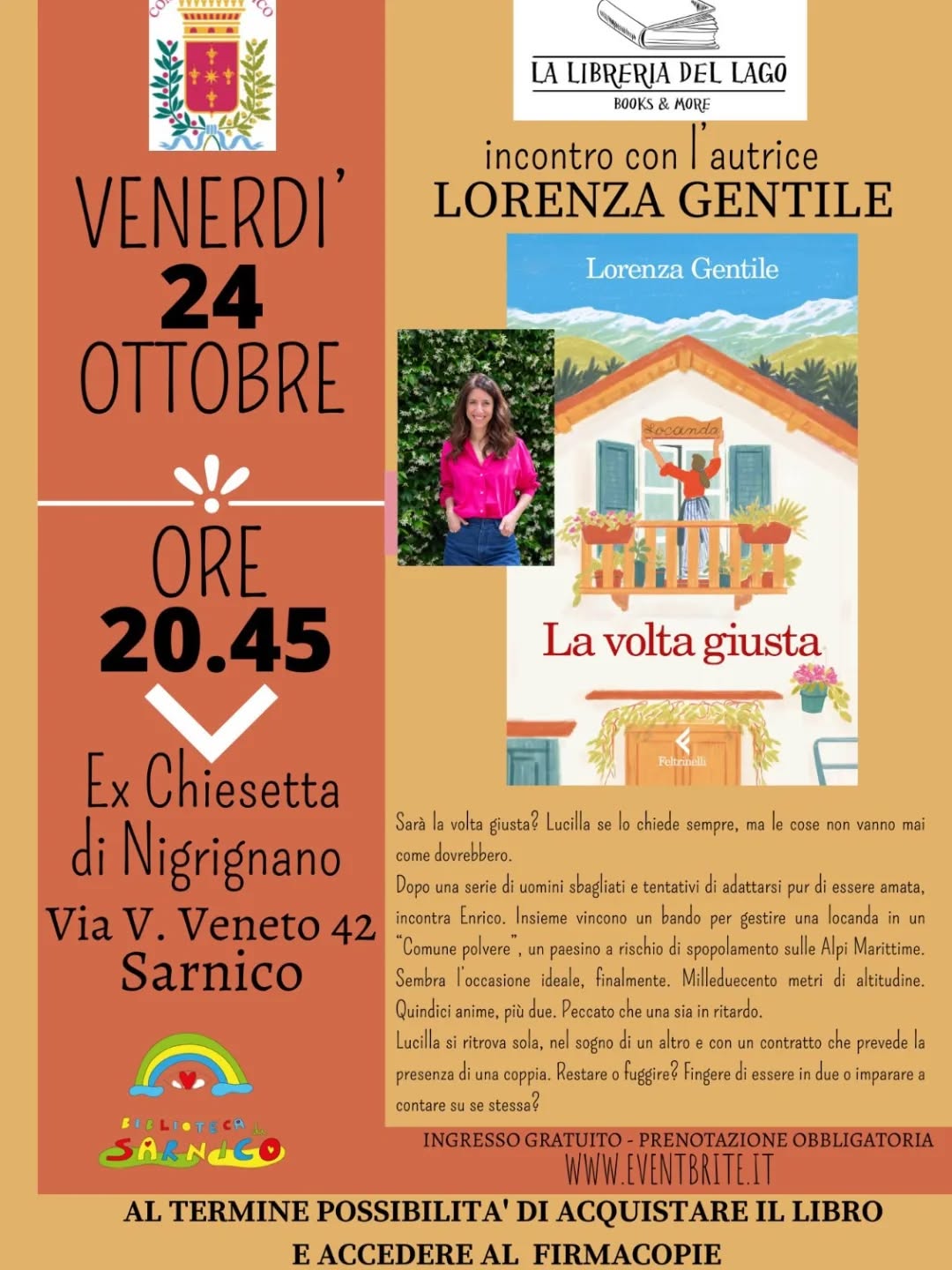 On Friday, October 24th, at 8:45 pm, the presentation of Lorenza Gentile’s novel “La volta giusta” (The Right Time) will take place at the Ex Chiesetta in Nigrignano in Sarnico.