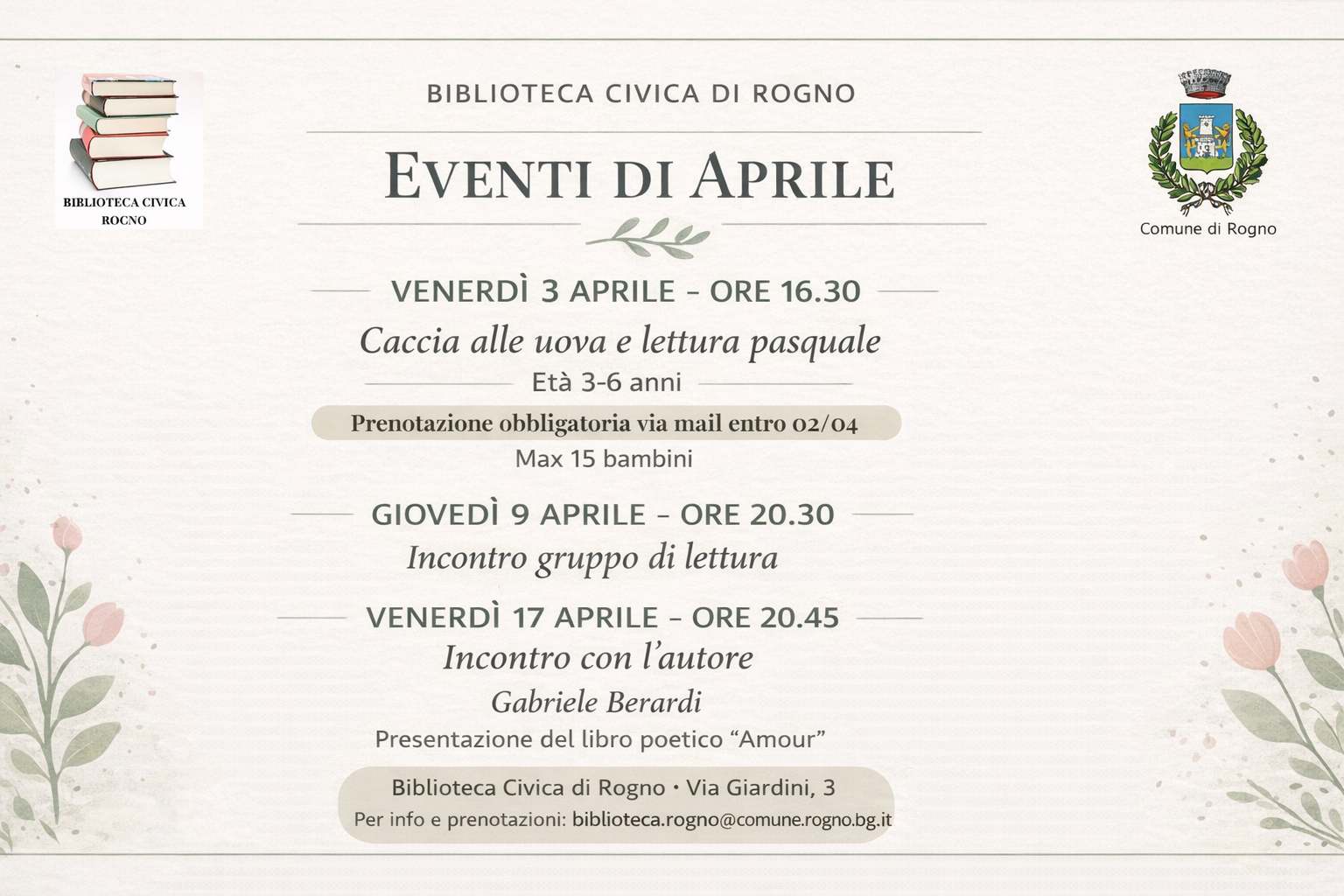 The Rogno Library is organizing 3 events for the month of April dedicated to everyone, that will take place in the library: