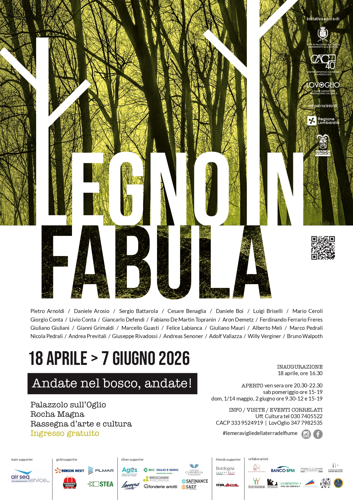 Saturday, April 18th 2026 will see the opening of the exhibition “Legno in Fabula. Andate nel bosco, andate!”, held at the Rocha Magna (Castle) in Palazzolo sull’Oglio as part of the “Le Meraviglie della Terra del Fiume 2026” season. The initiative, promoted by the Municipality in collaboration with LovOglio and CACP and sponsored by the Lombardy Region and the Province of Brescia, offers an immersive journey into the symbolism of wood, structured like a fairy tale and enriched by works by national and international artists; the exhibition also celebrates the 40th anniversary of CACP with a dedicated documentary exhibition.