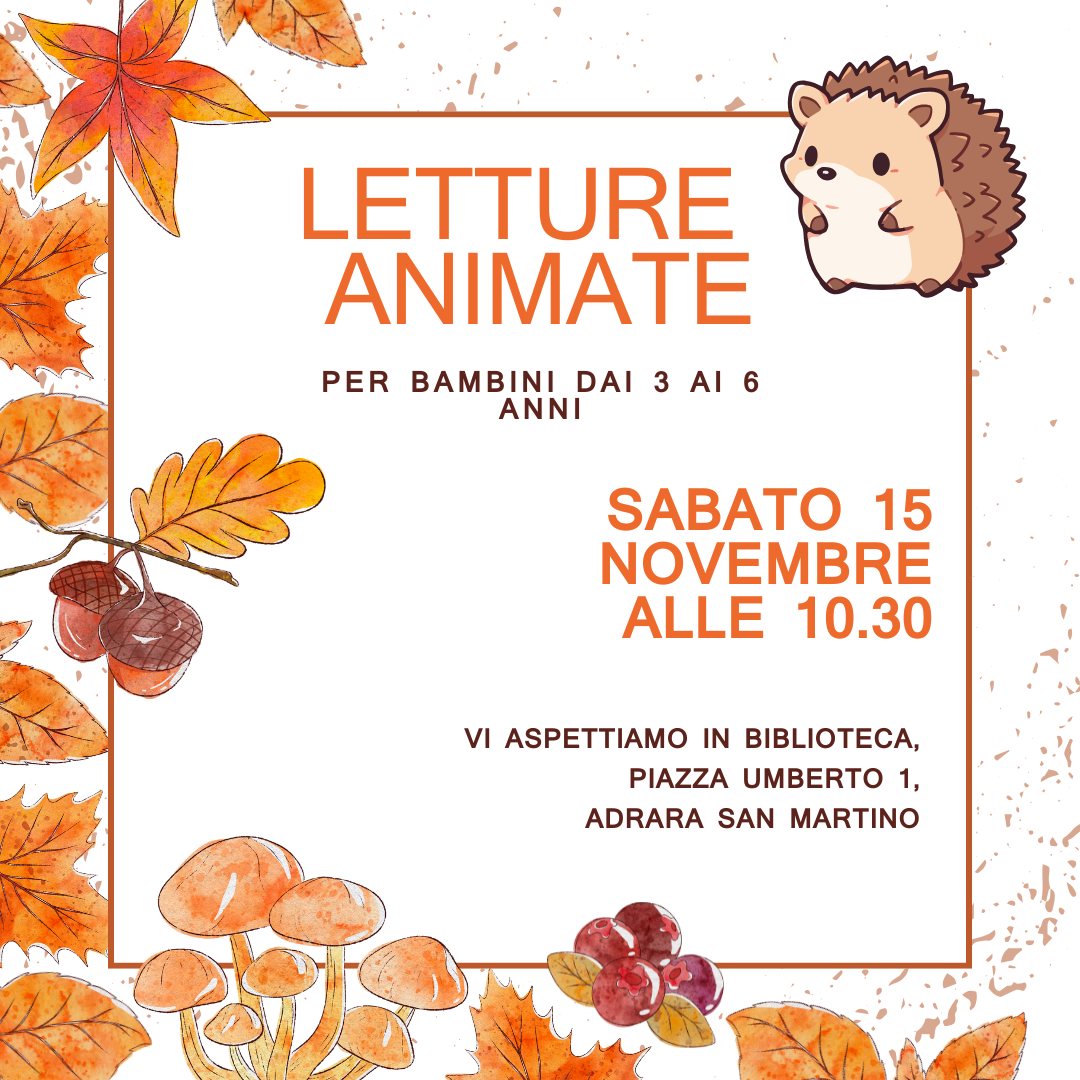 On Saturday, November 15th, at 10:30 am, Animated Readings for children aged 3 to 6 will be held at the Adrara San Martino Library.