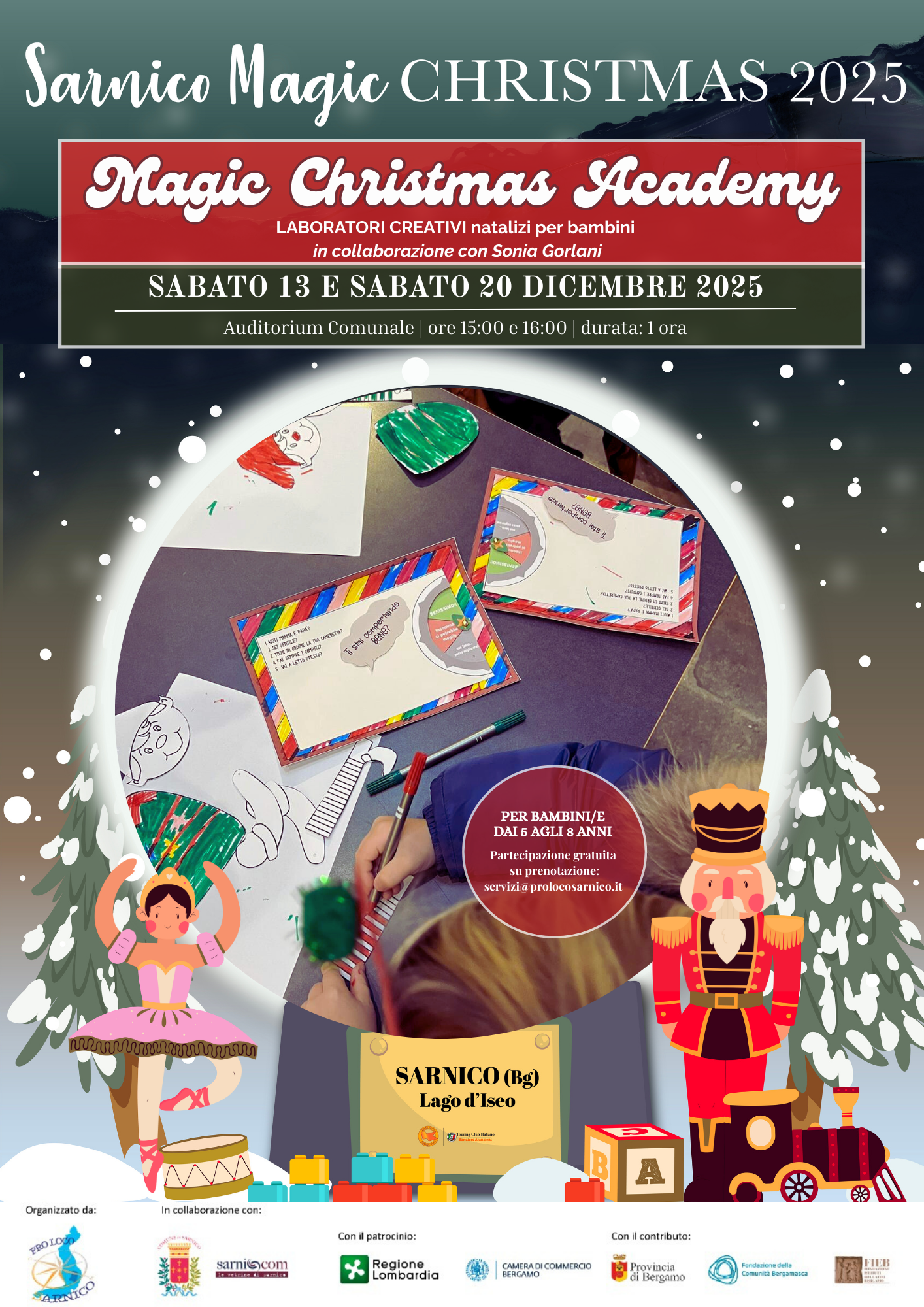 As part of the “Sarnico Magic Christmas…where Dreams Come True” event, the “Magic Christmas Academy” event, a creative Christmas workshop for children with Sonia Gorlani, will be held on Saturday, December 13th, 2025, at 3:00 pm and 4:00 pm at the Sarnico Municipal Auditorium.