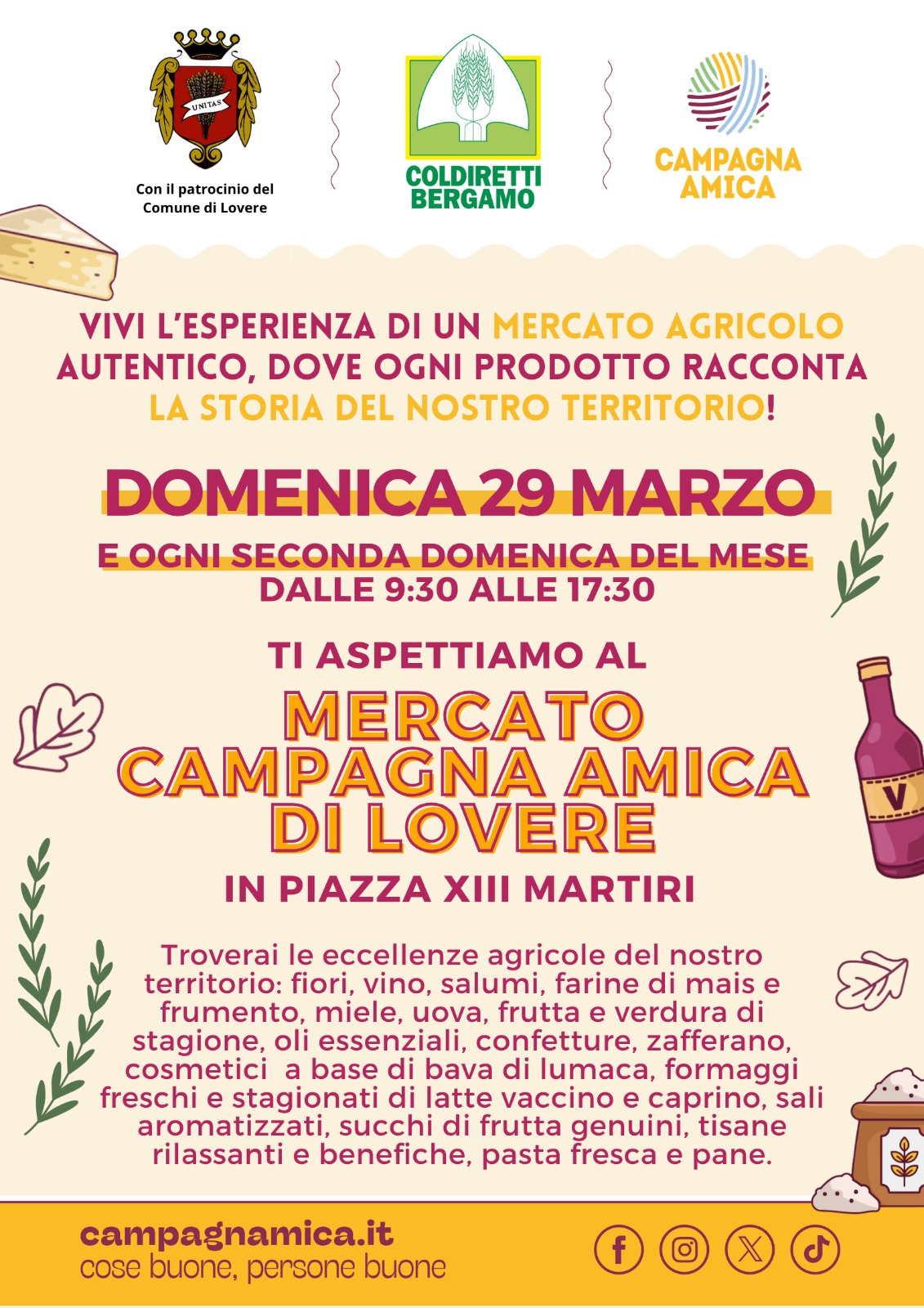 Piazza Tredici Martiri will host, Sunday, March 29, 2026, from 9:30 a.m. to 5:30 p.m, the traditional market of “Campagna Amica” of Coldiretti Bergamo.