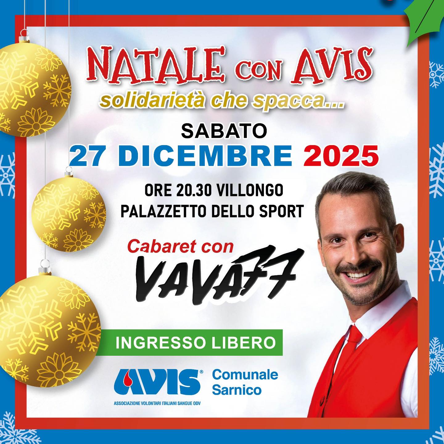 On Saturday, December 27th, at 8:30 pm, the “Christmas with AVIS” event will take place at the Palazzetto dello Sport in Villongo. It will be an evening of solidarity and laughter with the Cabaret di Vava 77.