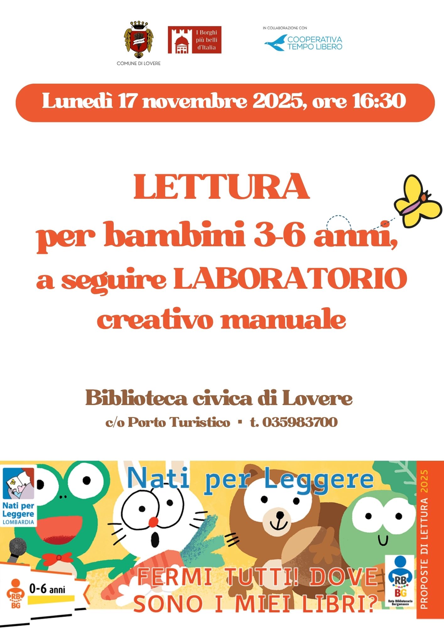 In celebration of “Born to Read” month, a reading for children from 3 to 6 will be held at the Lovere Civic Library on Monday, November 17, 2025, followed by a creative hands-on workshop.