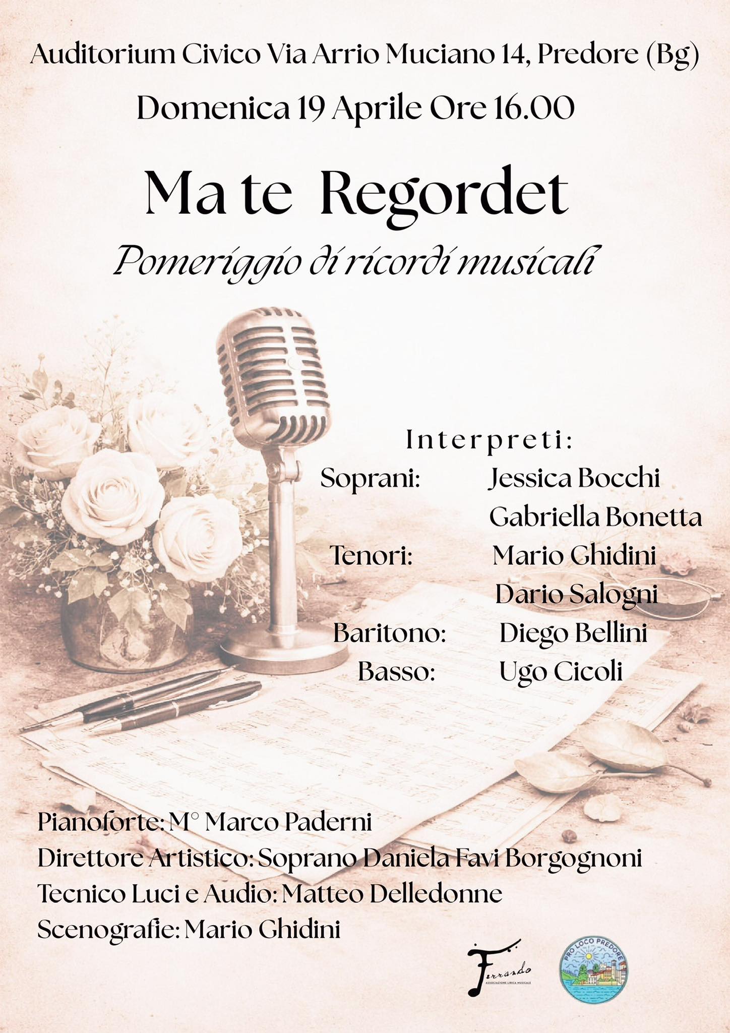 On Sunday, April 19th, at 4:00 pm, an afternoon of musical remembrances “Ma te Regordet” will be held at the Civic Auditorium in Predore.