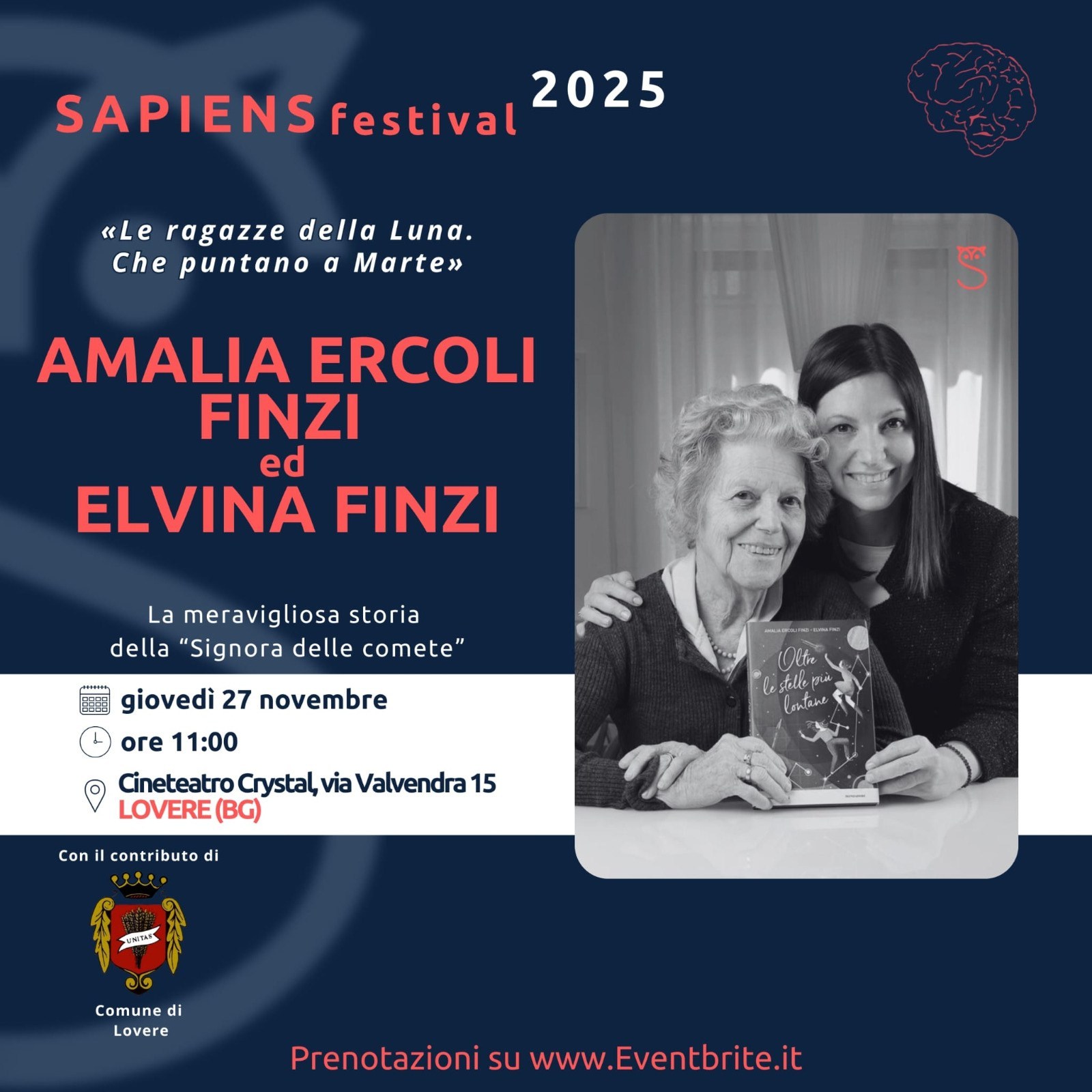 On the occasion of the sixth edition of the Sapiens Festival, on Thursday 27 November 2025, at 11:00 a.m., at the Crystal Cinema Theater in Lovere, there will be a talk with Amalia Ercoli Finzi and Elvina Finzi—the Moon Girls Who Aim for Mars—who will present the wonderful story of the “Lady of the Comets.”