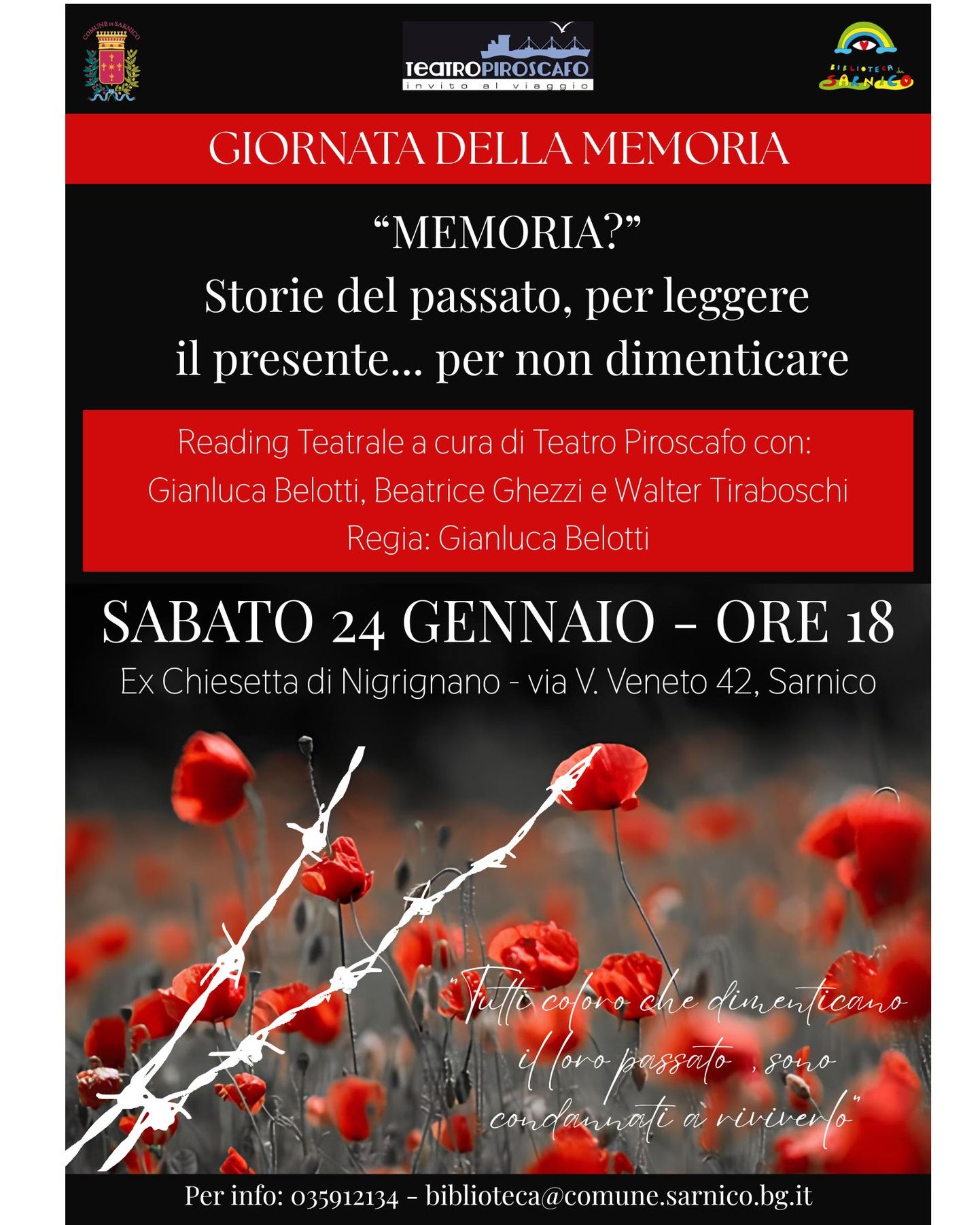 On the occasion of Holocaust Remembrance Day, on Saturday, January 24th, at 6:00 pm, the performance “Memory? – Stories from the Past, to Read the Present…Let’s Not Forget”, performed by Teatro Piroscafo, will be held at the former church in Nigrignano in Sarnico.