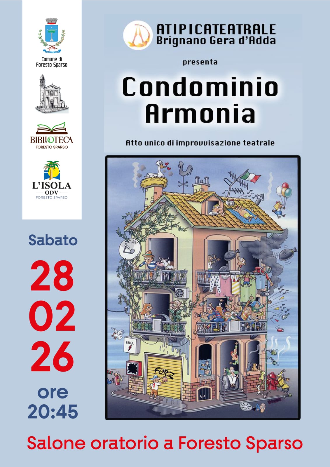 On Saturday, February 28th, at 8:45 pm, the theatrical performance “Condominio Armonia” will take place in the hall of the Oratory of Foresto Sparso.