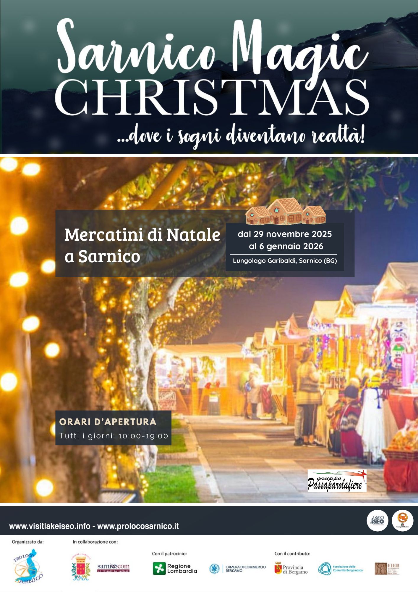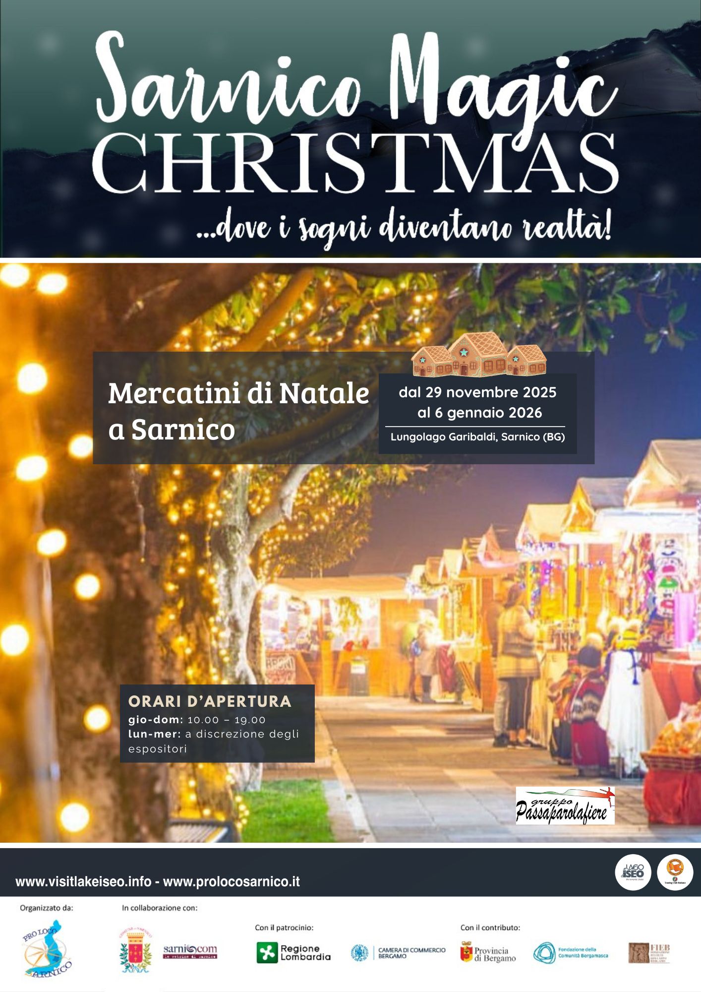 On the occasion of Sarnico Magic Christmas, from Saturday 29th November 2025 to Tuesday 6th January 2026, there will be CHRISTMAS MARKETS along the Sarnico lakefront.