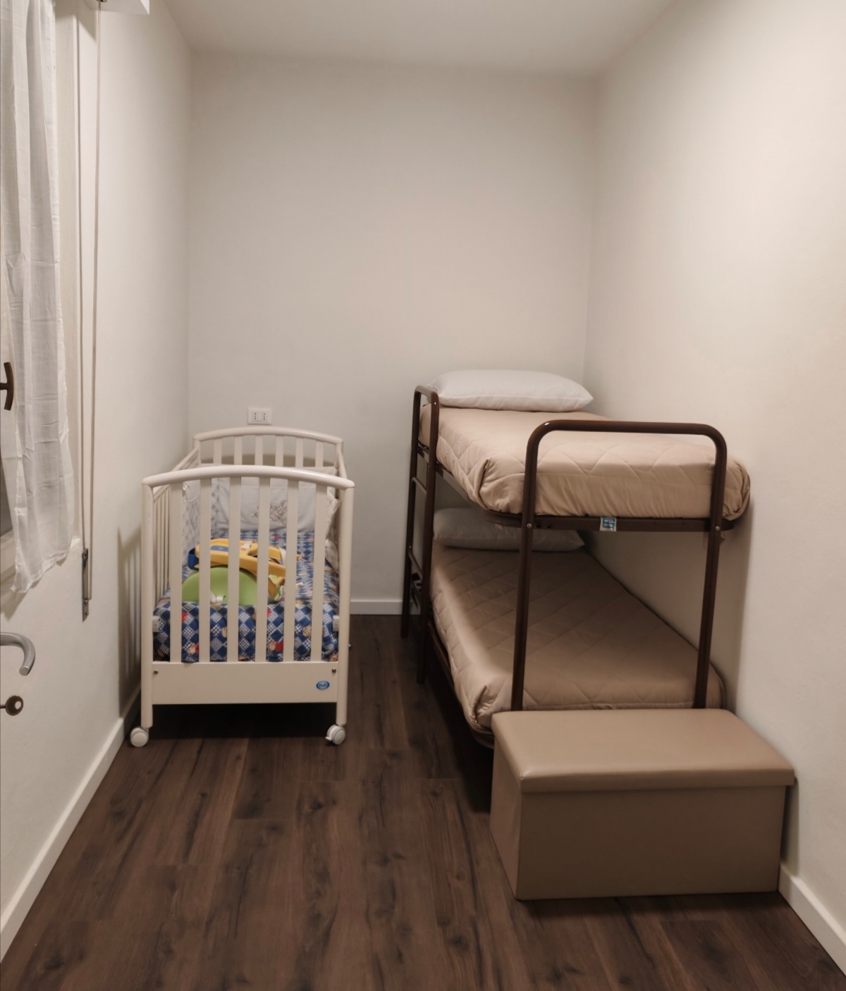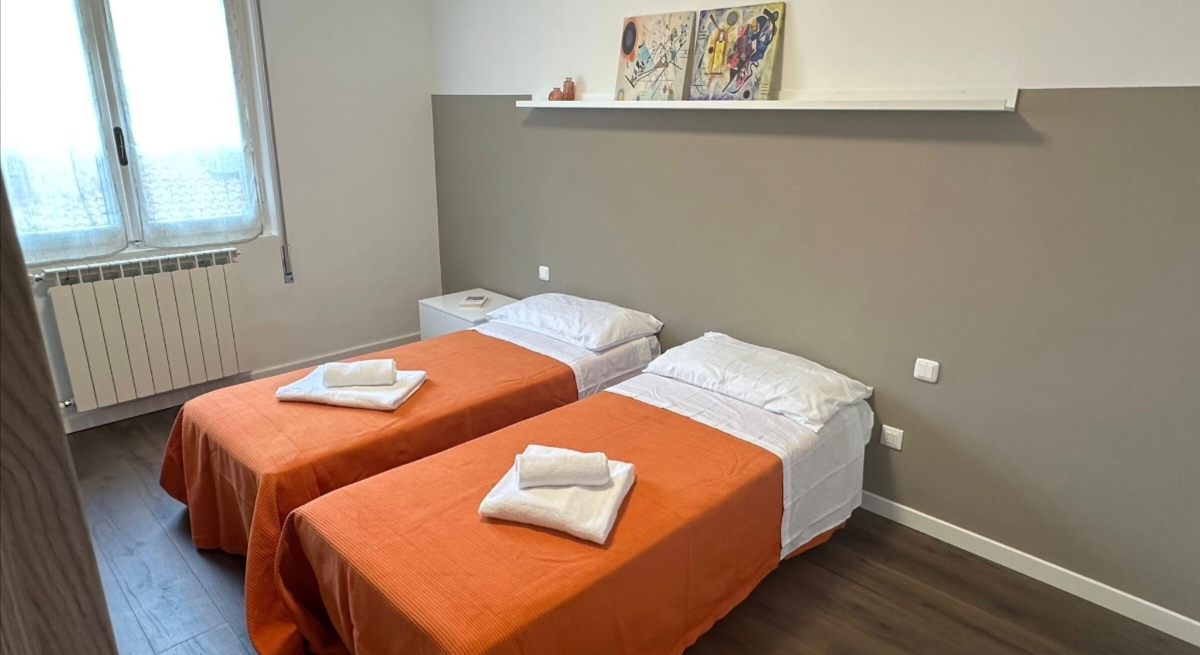 The apartment has private parking in a garage 300 meters away. Recently renovated, it features three bedrooms: a double bedroom with an additional single bed, a twin bedroom with two single beds, and a bedroom with a bunk bed. A cot is also available.