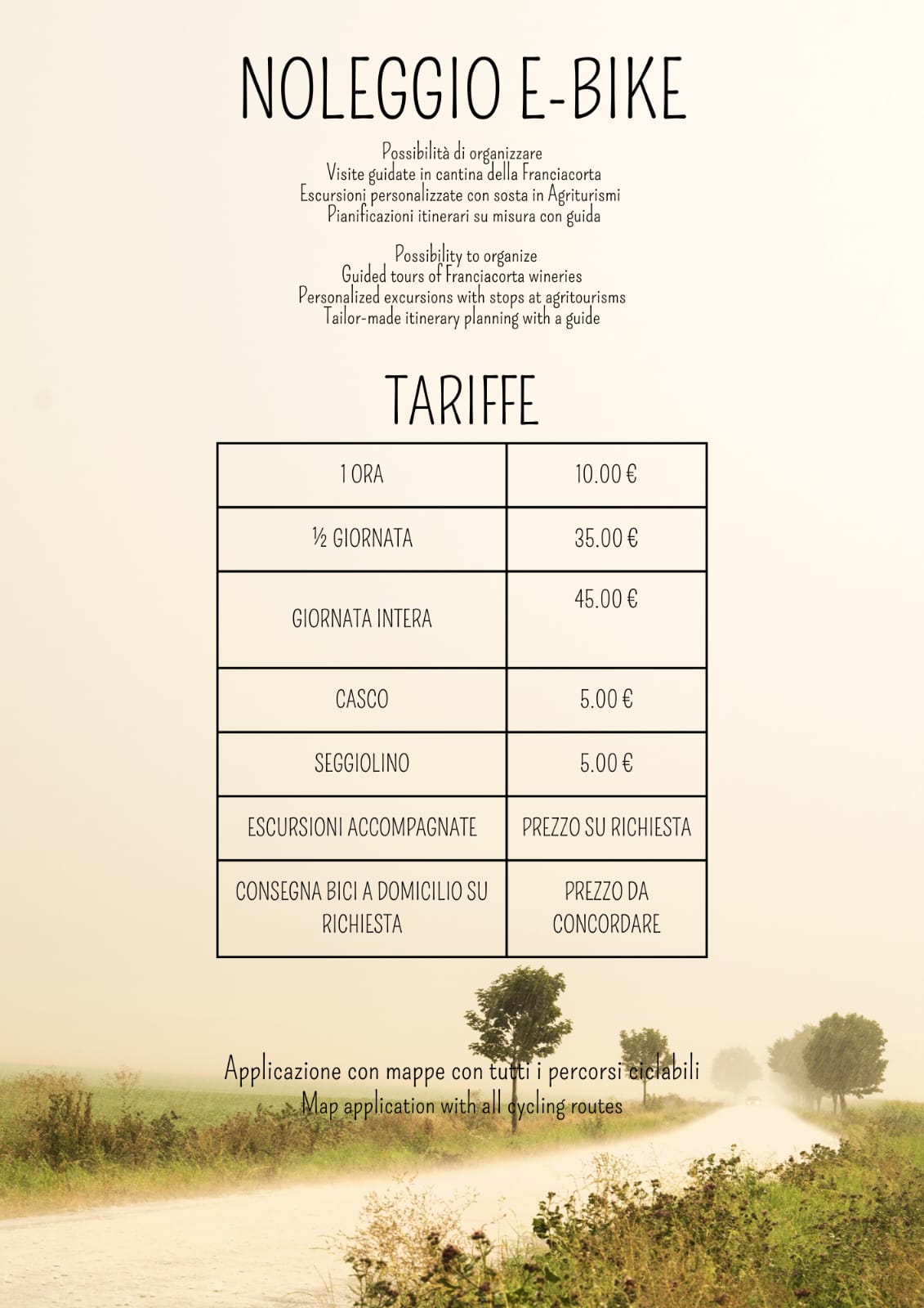 Fitlanda Fitness offre inoltre un servizio di noleggio e-bike flessibile, con formule a ore, mezza giornata, giornata intera o anche a lungo termine, inclusa la consegna a domicilio. Possibilità di partecipare a escursioni guidate.