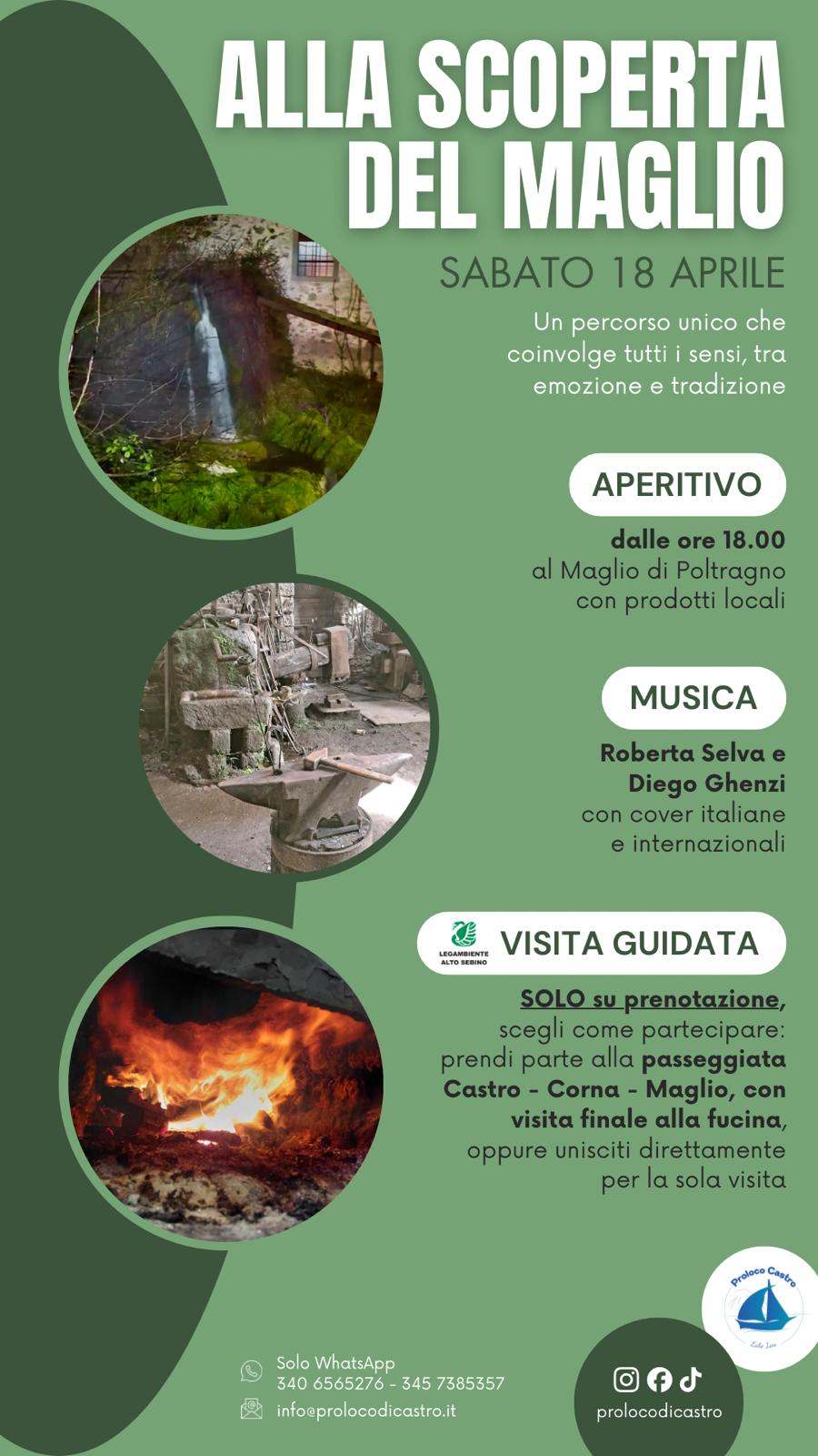 Pro Loco Castro organizza per sabato 18 aprile una serata alla scoperta del maglio di Poltragno. Un percorso unico che coinvolge tutti i sensi, tra emozione e tradizione.