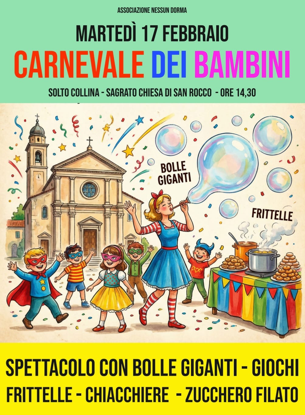 L’Associazione Nessun Dorma organizza, martedì 17 febbraio 2026, un pomeriggio “Carnevale dei bambini” pensato per i più piccolini.