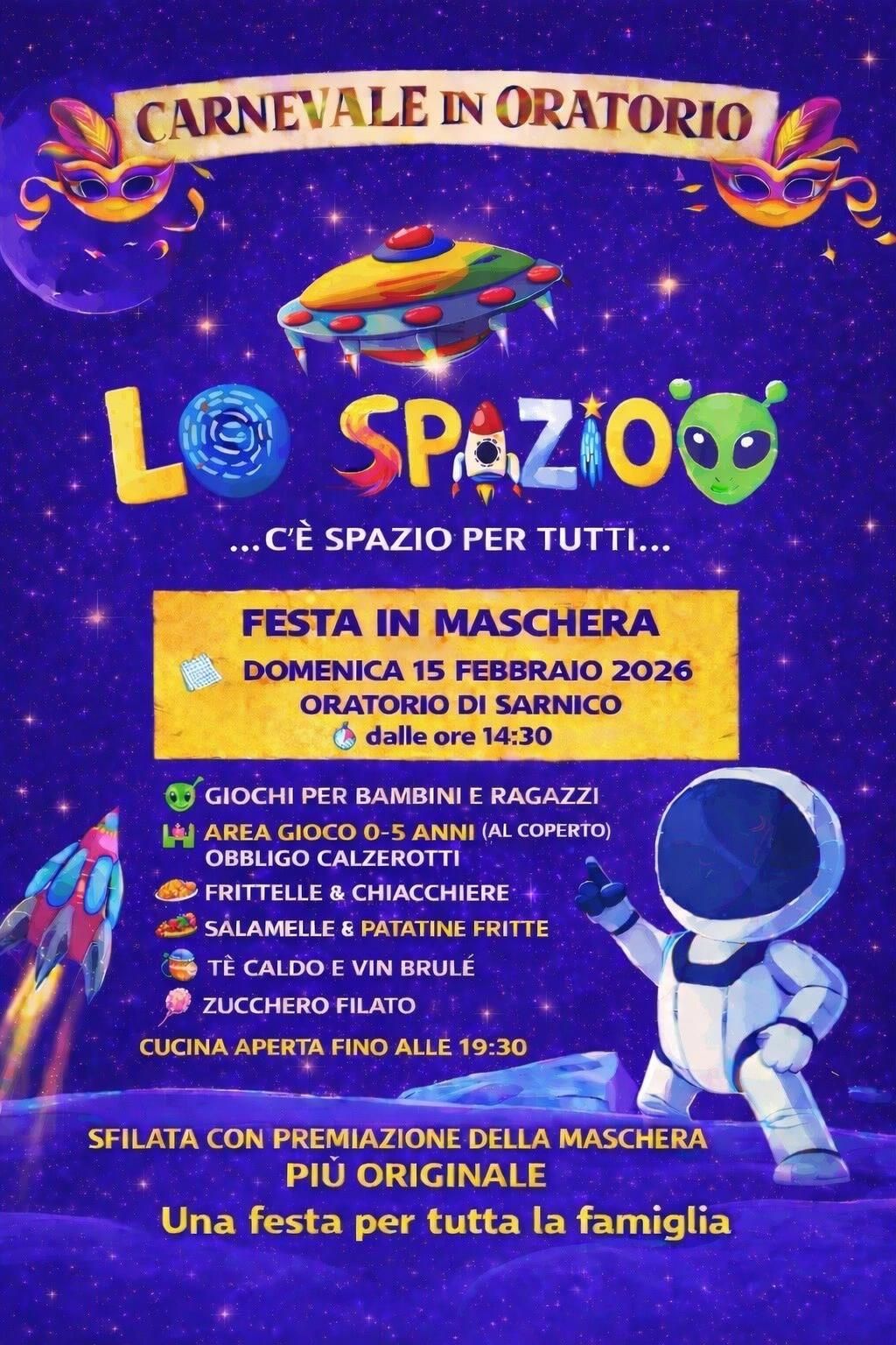 Domenica 15 febbraio, dalle ore 14:30, si terrà la Festa di Carnevale “Lo Spazio…c’è spazio per tutti…” presso l’Oratorio di Sarnico.