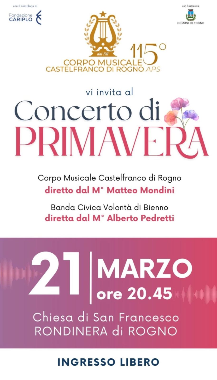 Sabato 21 marzo 2026 alle ore 20:45, la Chiesa di San Francesco di Rondinera a Rogno ospiterà il “Concerto di primavera”, organizzato dal Corpo Musicale Castelfranco di Rogno con la collaborazione della Banda Civica Volontà di Bienno.