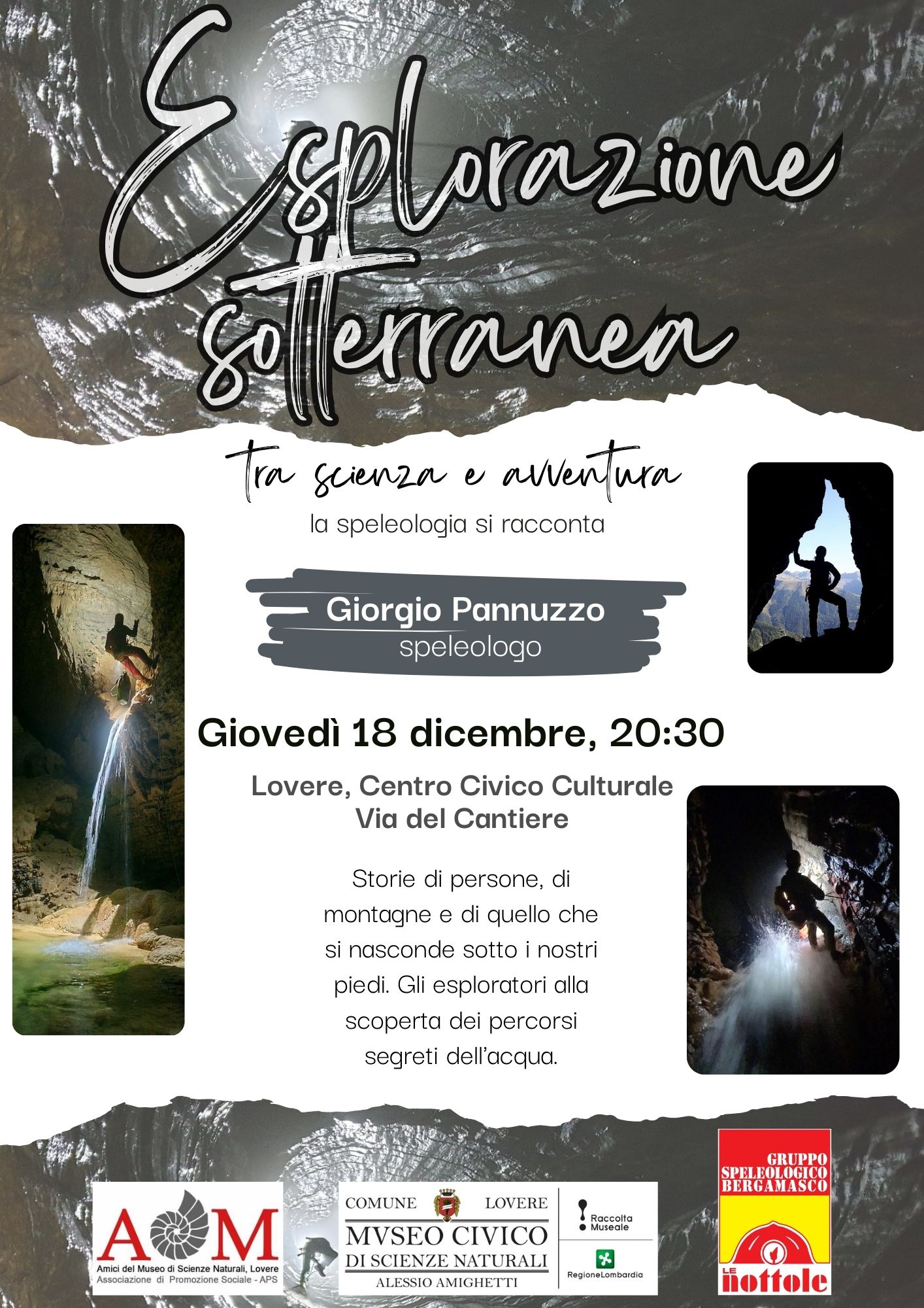 Giovedì 18 dicembre, alle ore 20:30 presso il Centro Civico Culturale in via del Cantiere a Lovere, si terrà una serata con lo speleologo Giorgio Pannuzzo.