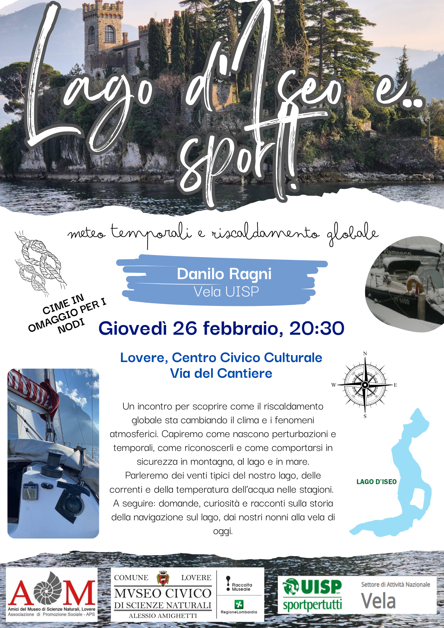 Giovedì 26 febbraio 2026, alle ore 20:30 presso il Centro Civico Culturale in Via del Cantiere al Porto Turistico a Lovere, si terrà la conferenza a cura di Danilo Ragni, dal titolo “Lago d’Iseo e.. sport” – meteo temporali e riscaldamento globale.