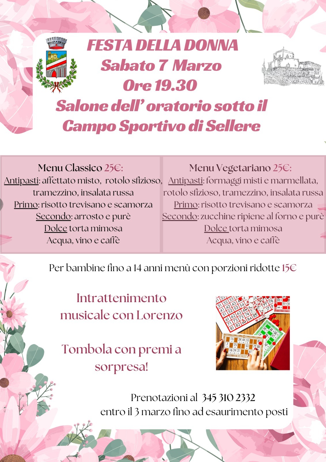 Sabato 7 marzo alle ore 19:30, presso il Salone dell’Oratorio sotto il Campo Sportivo di Sellere si terrà una cena in occasione della festa della donna.