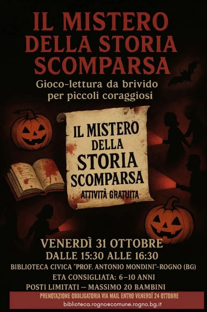 Venerdì 31 ottobre dalle 15:30 alle 16:30, presso la biblioteca civica “Prof. Antonio Mondini” di Rogno, si terrà un pomeriggio per bambini dai 6 ai 10 anni a tema Halloween dal titolo “Il mistero della storia scomparsa”.