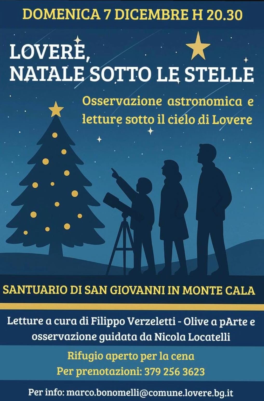 Domenica 7 dicembre San Giovanni in monte Cala a Lovere sarà il palcoscenico dell’iniziativa “Natale sotto le stelle”, una serata di osservazione astronomica di luna, pianeti e altri corpi celesti attraverso il telescopio guidati dall’esperto Nicola Locatelli.