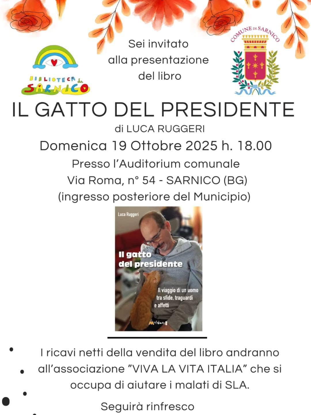 Domenica 19 ottobre, alle ore 18:00, all’Auditorium Comunale di Sarnico, si terrà la presentazione del libro “Il gatto del presidente” di Luca Ruggeri, un viaggio intimo e toccante tra sfide, traguardi e affetti. Modera Francesca Fenaroli.