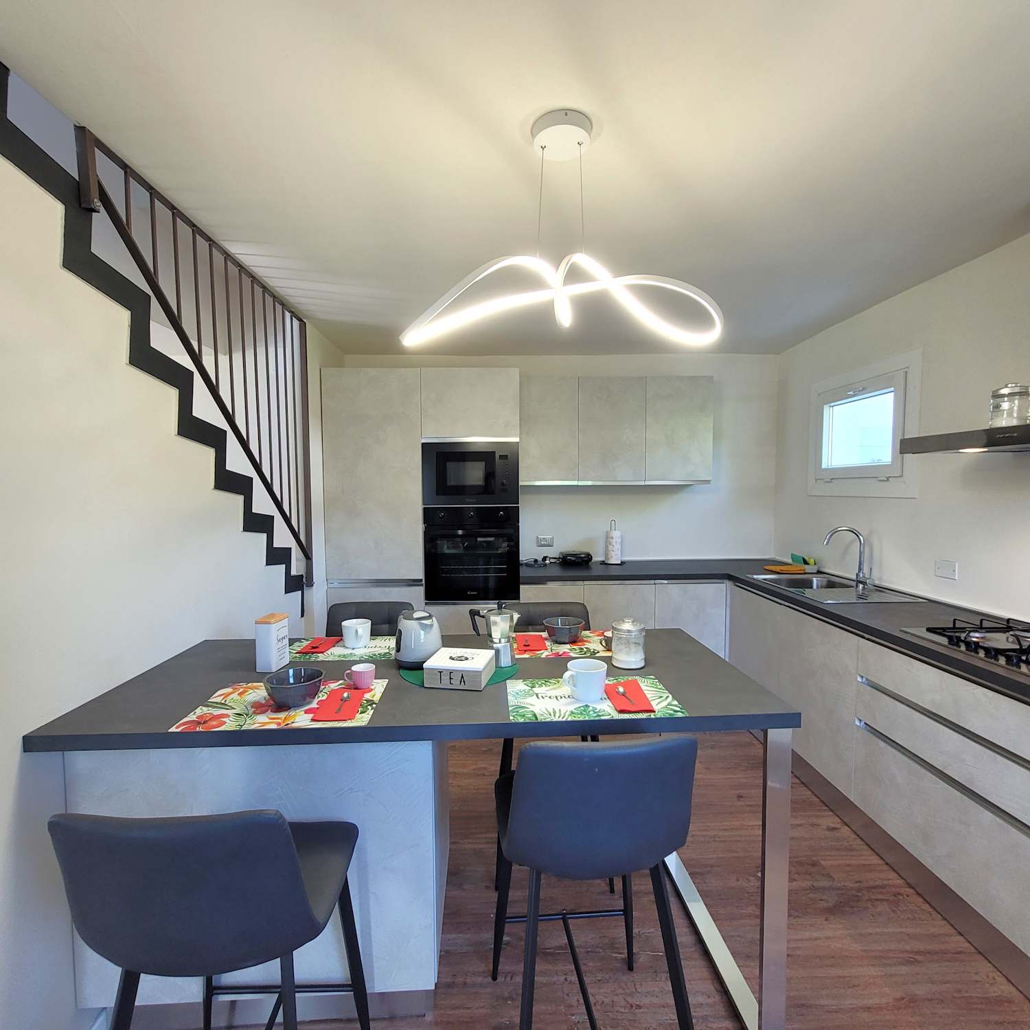 Ampio open space con salotto con comodo divano e tv smart monitor e cucina attrezzata con lavastoviglie