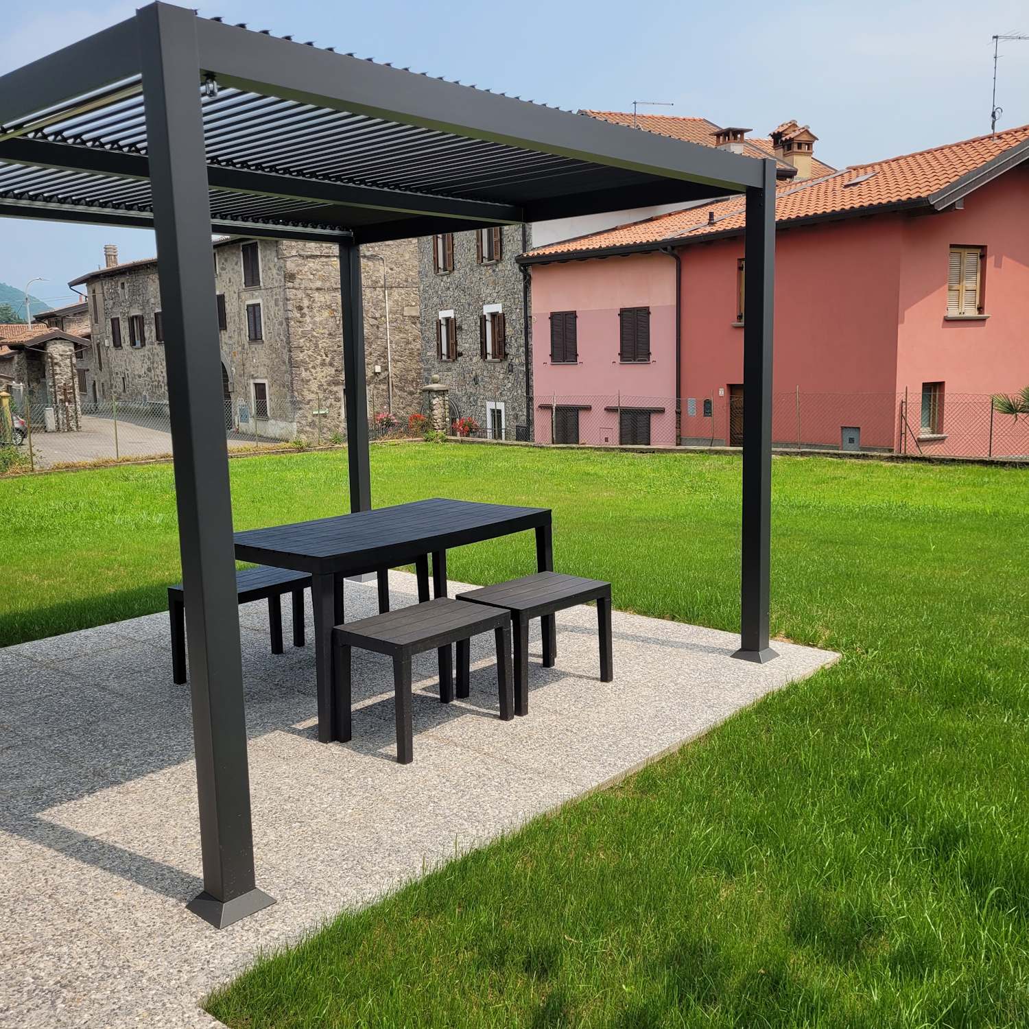 Giardino recintato e attrezzato con barbecue, pergola con tavolo e sedie, lettini prendisole